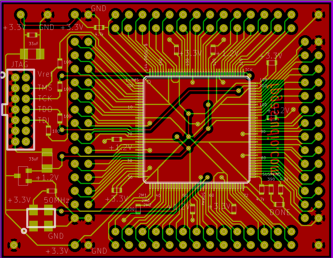 (Ebay description) FPGA XC3S50AN, package TQG144, in-system Flash memory, anti-cloning protection. 50 MHz clock @ pin 57, Frequency Stability: ± 25 PPM JTAG connector layout compatible with Xilinx® Platform Cable USB II, Model DLC10. (JTAG connector available for additional $1) Easy access to all I/O's (108 pins), I/O layout is compatible with 28 positions connector header 0.1" pitch (Example: TSW-114-07-G-D, Samtec Inc. Digi-Key number: SAM1028-14-ND) Single power supply 3.3V "DONE" LED Board size: 1.9 x 2.45 inches. Test configuration is loaded (pulses at pins 31, 32) Please add $1 to receive a JTAG connector (14 pin header, 2mm pitch, compatible with Xilinx® Platform Cable USB II) The board is fully functional, test configuration was designed and loaded using Xilinx® ISE Design Suite and Platform Cable USB II. For more information about FPGA XC3S50AN go to xilinx website and search for the datasheet DS557. |